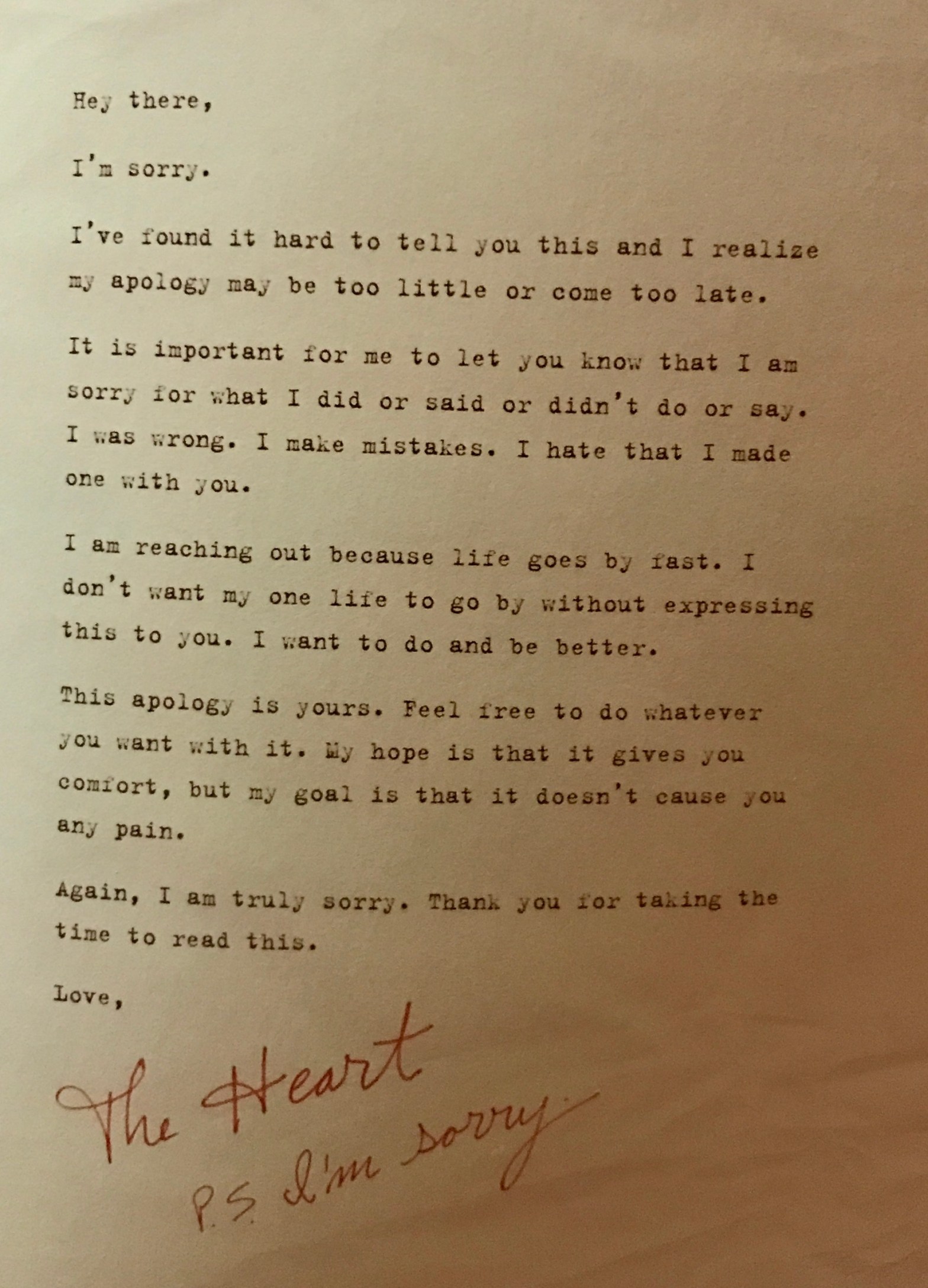 I started reading Amy Poehler’s book “Yes Please” and this morning I read the chapter on apologizing. She chronicles the story of being part of a seemingly offensive SNL sketch and writing a letter of apology 5 YEARS after the fact. If someone has hurt me or I’ve hurt them, I want it dealt with right quick. I hate starting new ventures with old baggage. Be it planet earth beginning a new year, a birthday, a new semester at school or a new job – I want a clean slate. I don’t like loose ends, lingering feelings, what-ifs, etc. All week, I’ve been seeing fights on social media and hearing about friend fights and family fights and romantic fights and so and on and so forth. As I was watching all this unfold, all I kept asking myself was “why don’t these people just say they’re sorry? You hurt me. I hurt you. Wait – I hurt you? Sorry! How hard is that?”